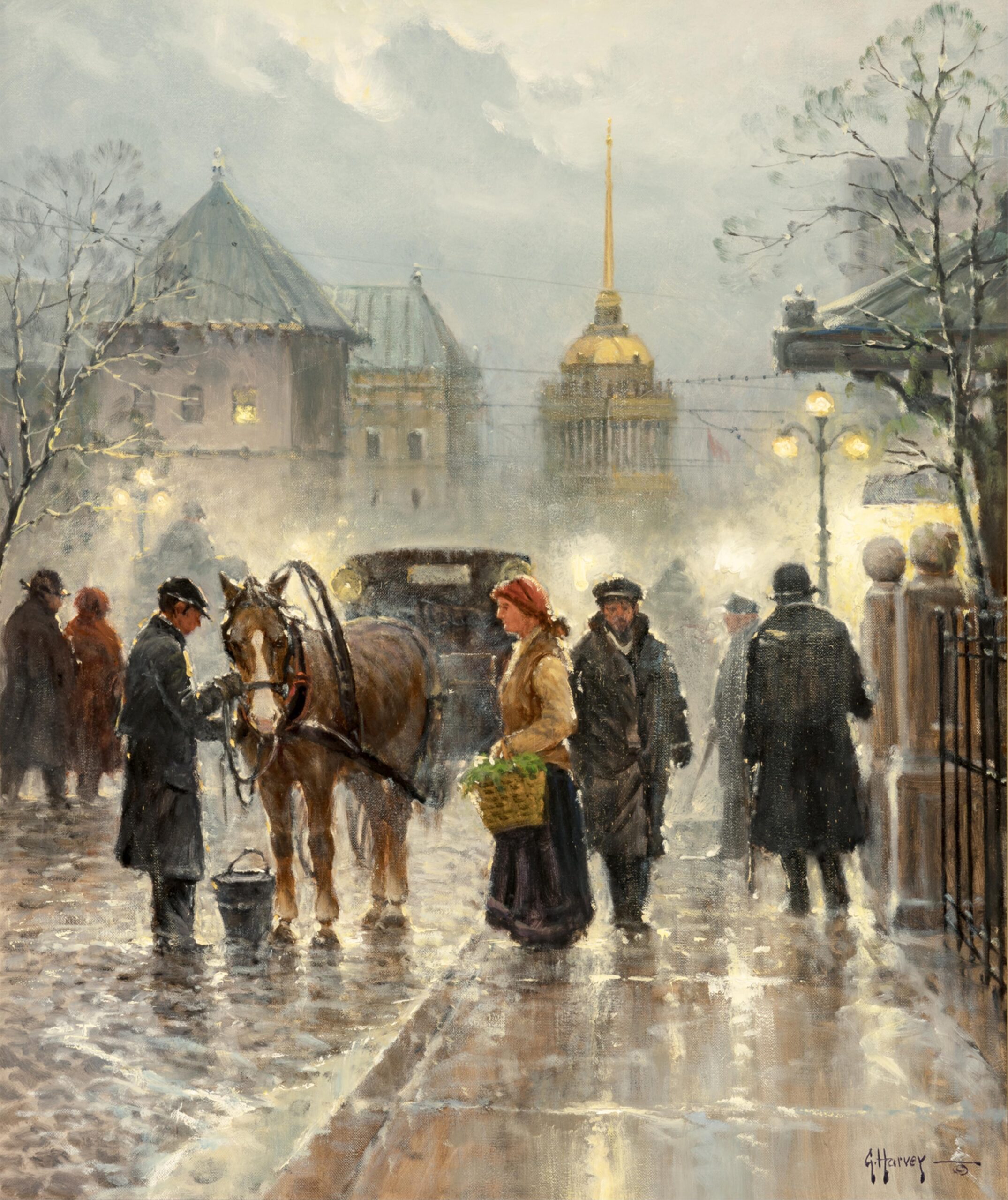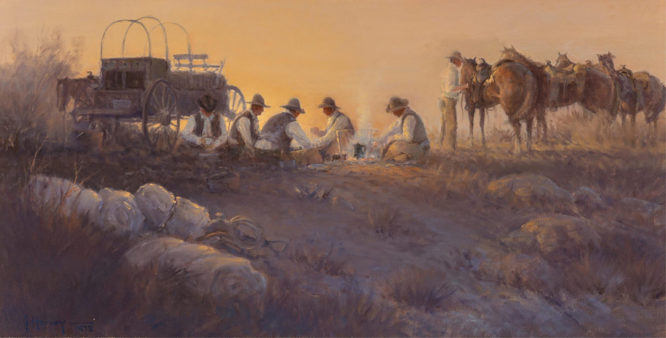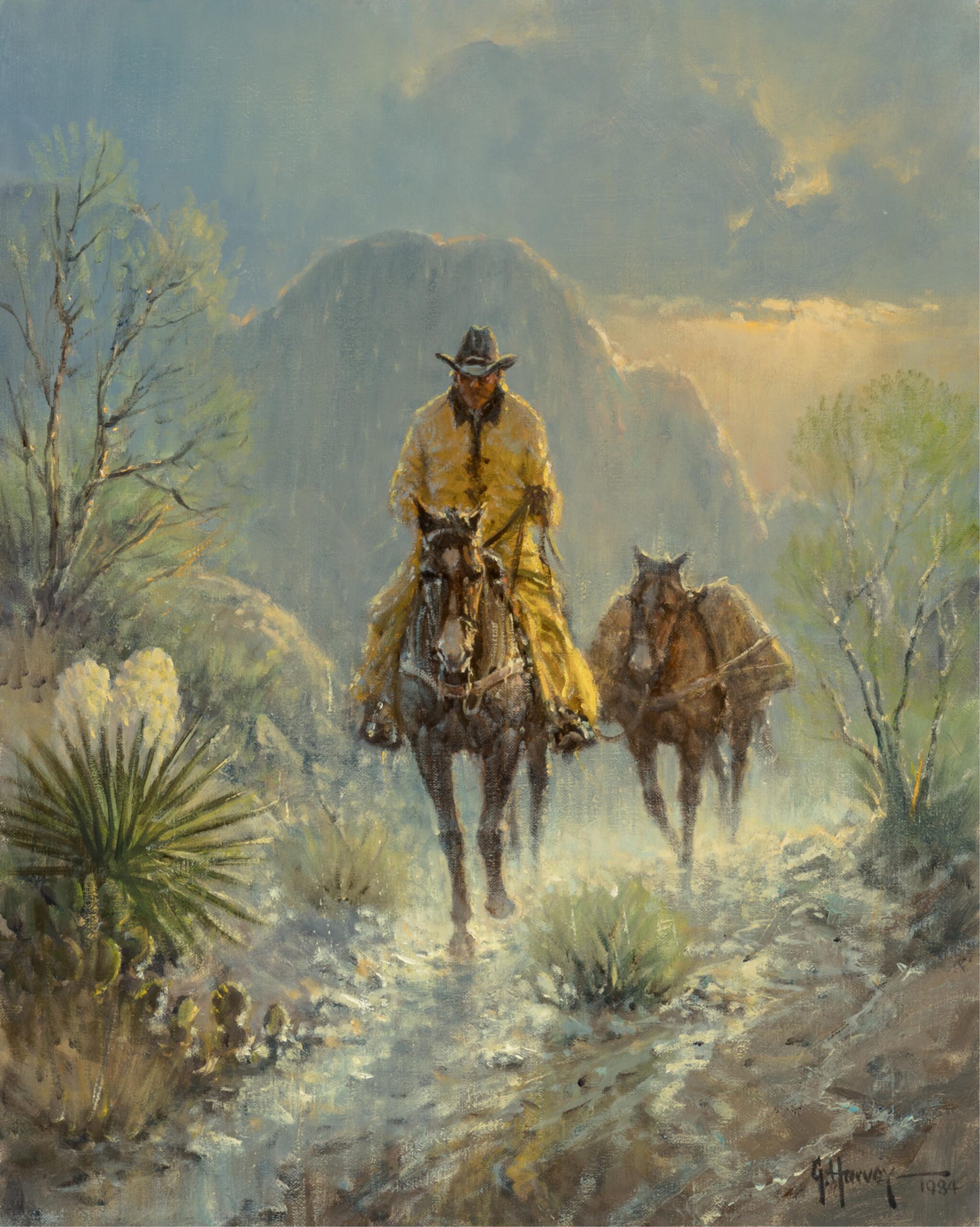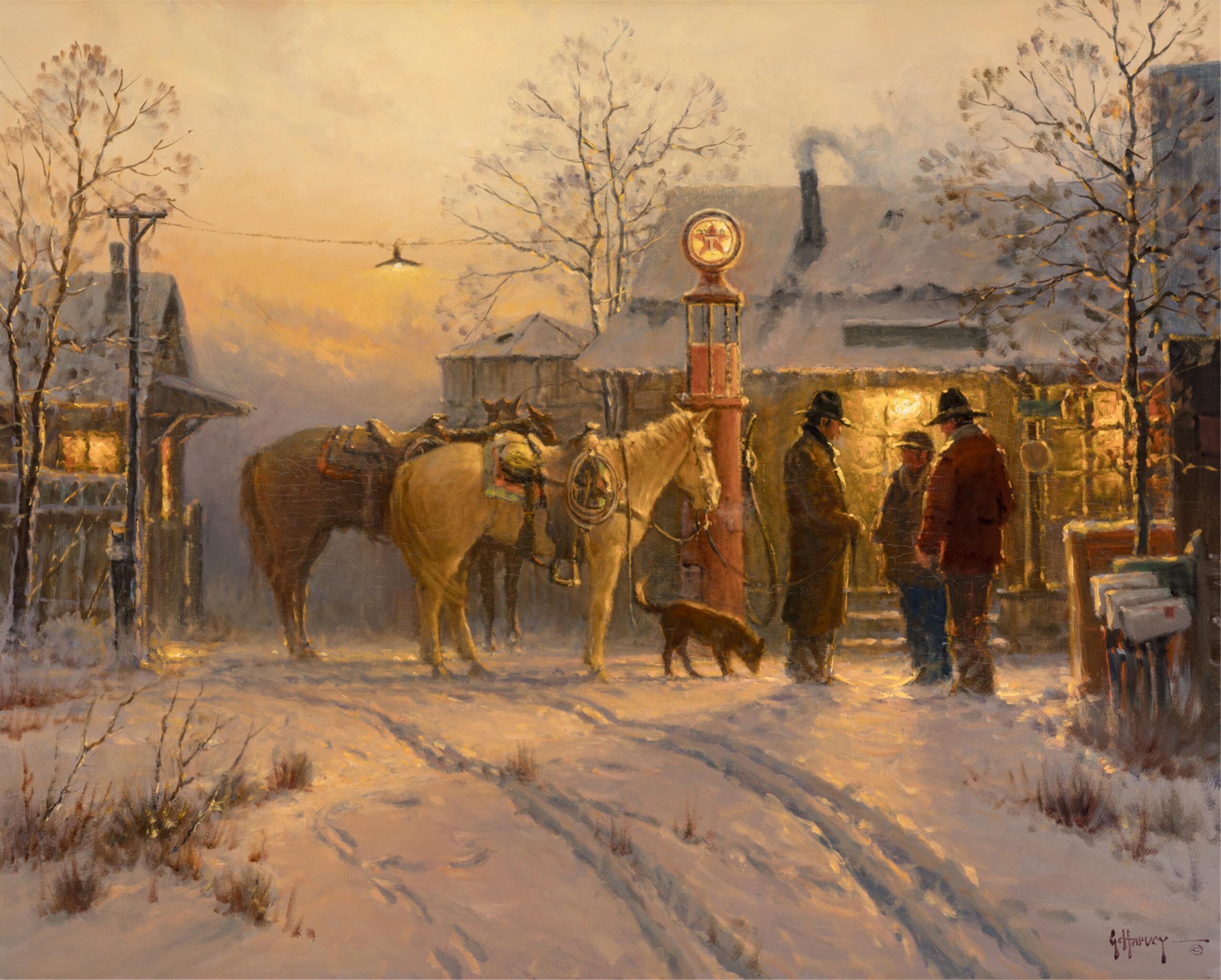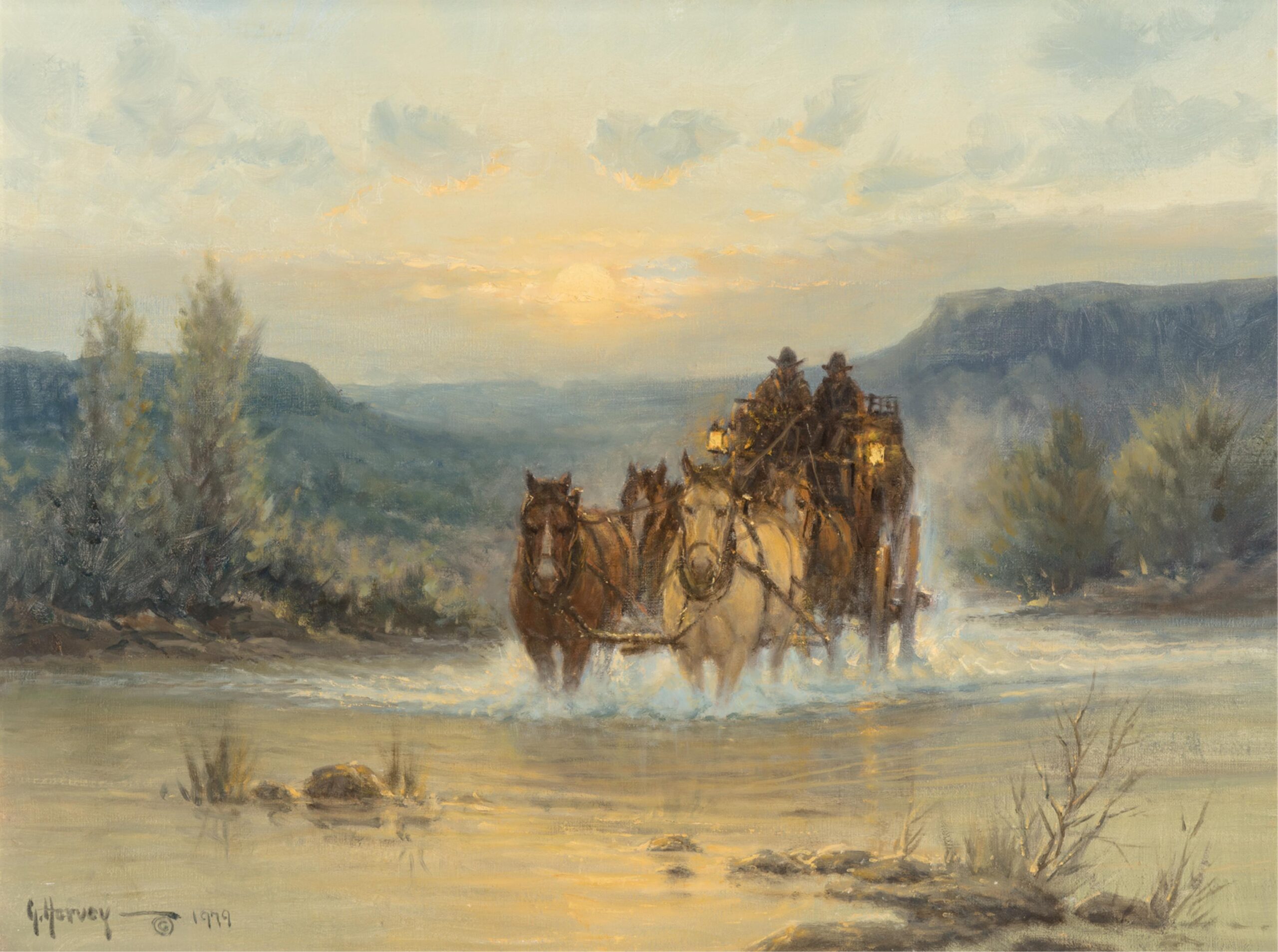 G. Harvey, born Gerald Harvey Jones in 1933 in San Antonio, Texas, was a renowned Western and American Impressionist painter celebrated for his evocative depictions of historical and frontier life. Inspired by the rugged landscapes and pioneer spirit of the American West, Harvey’s work often focused on themes of perseverance, tradition, and patriotism. His signature style blended romanticism with realism, capturing cowboys, oilmen, and bustling turn-of-the-century cityscapes bathed in the warm glow of lamplight or twilight. Harvey conveyed motion and atmosphere, often portraying scenes of daily life that echoed the values of hard work, faith, and heritage. Whether illustrating horseback riders crossing stormy plains or elegant 19th-century street scenes, his paintings conveyed a deep nostalgia for America’s past. Harvey’s work has been displayed in the White House and prestigious collections, and his legacy continues to influence contemporary Western art.