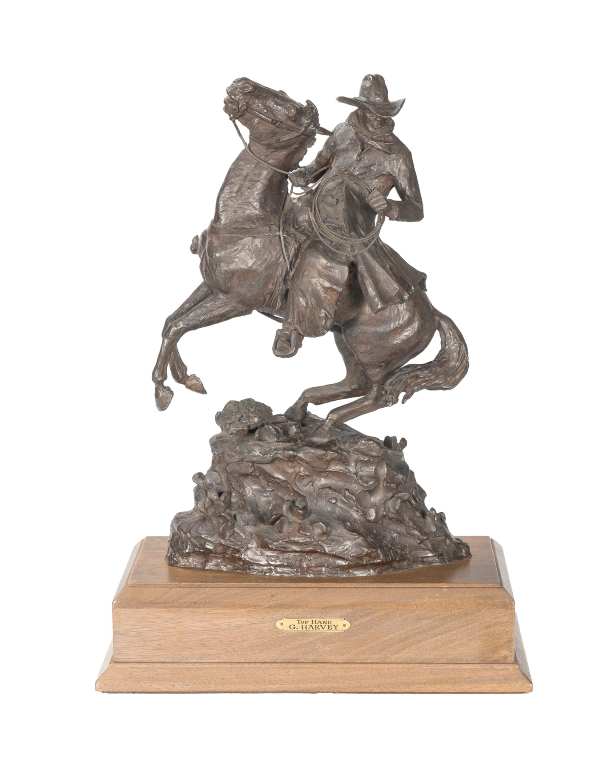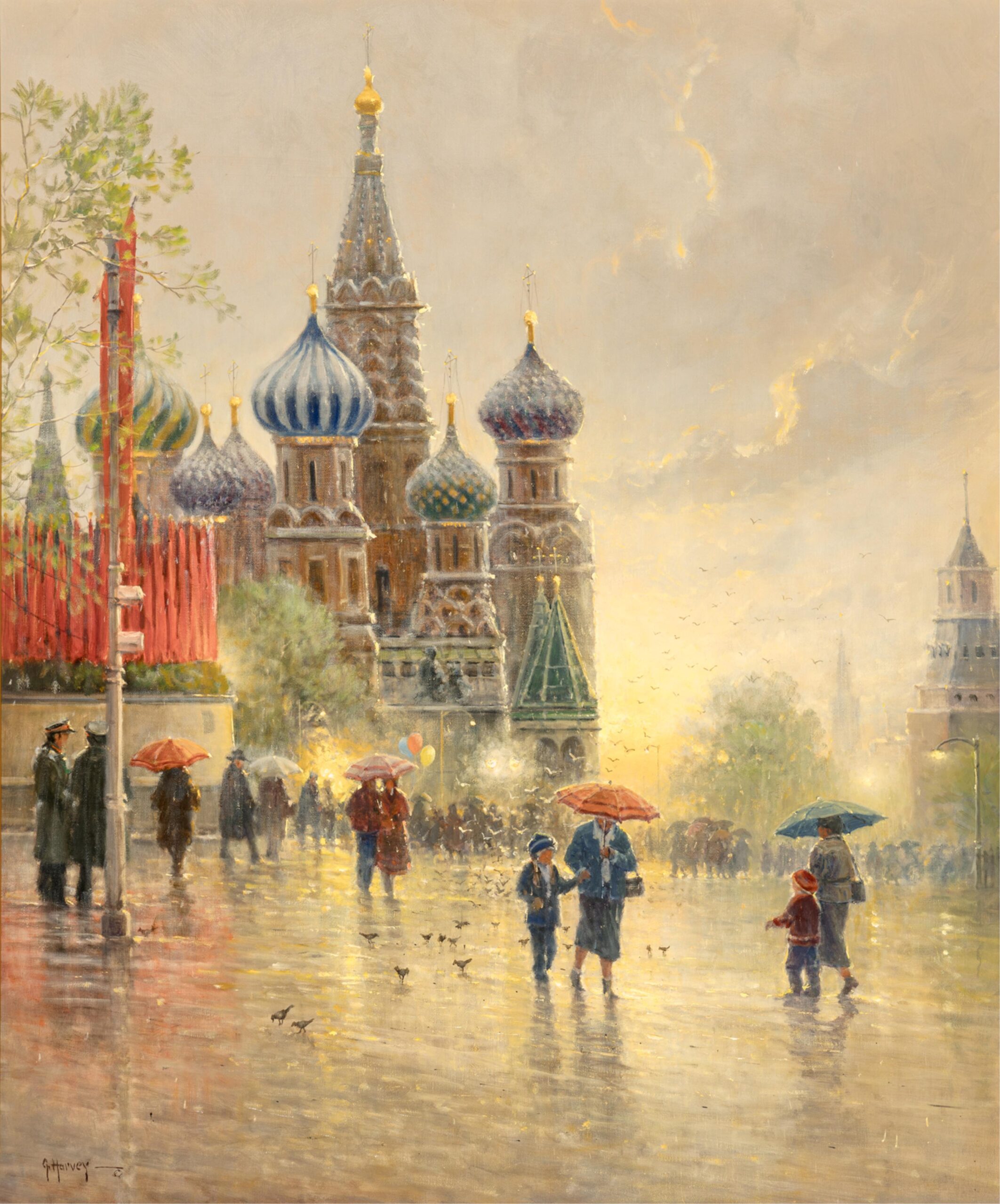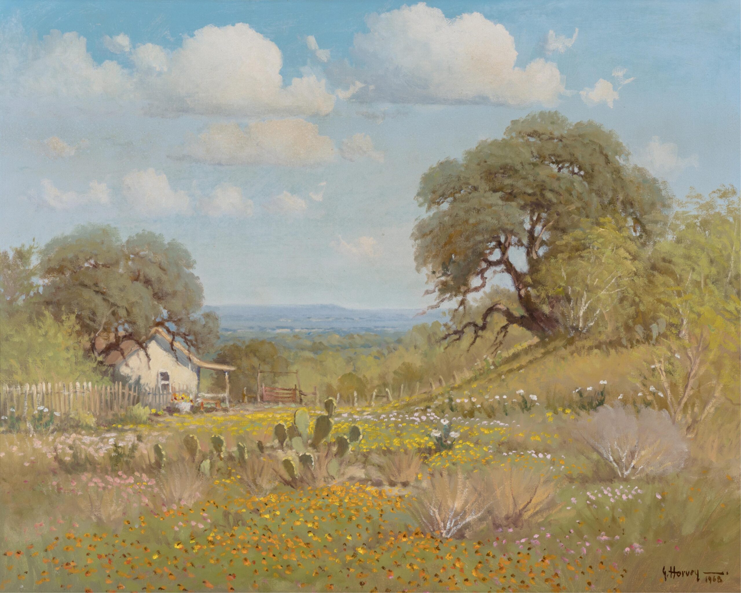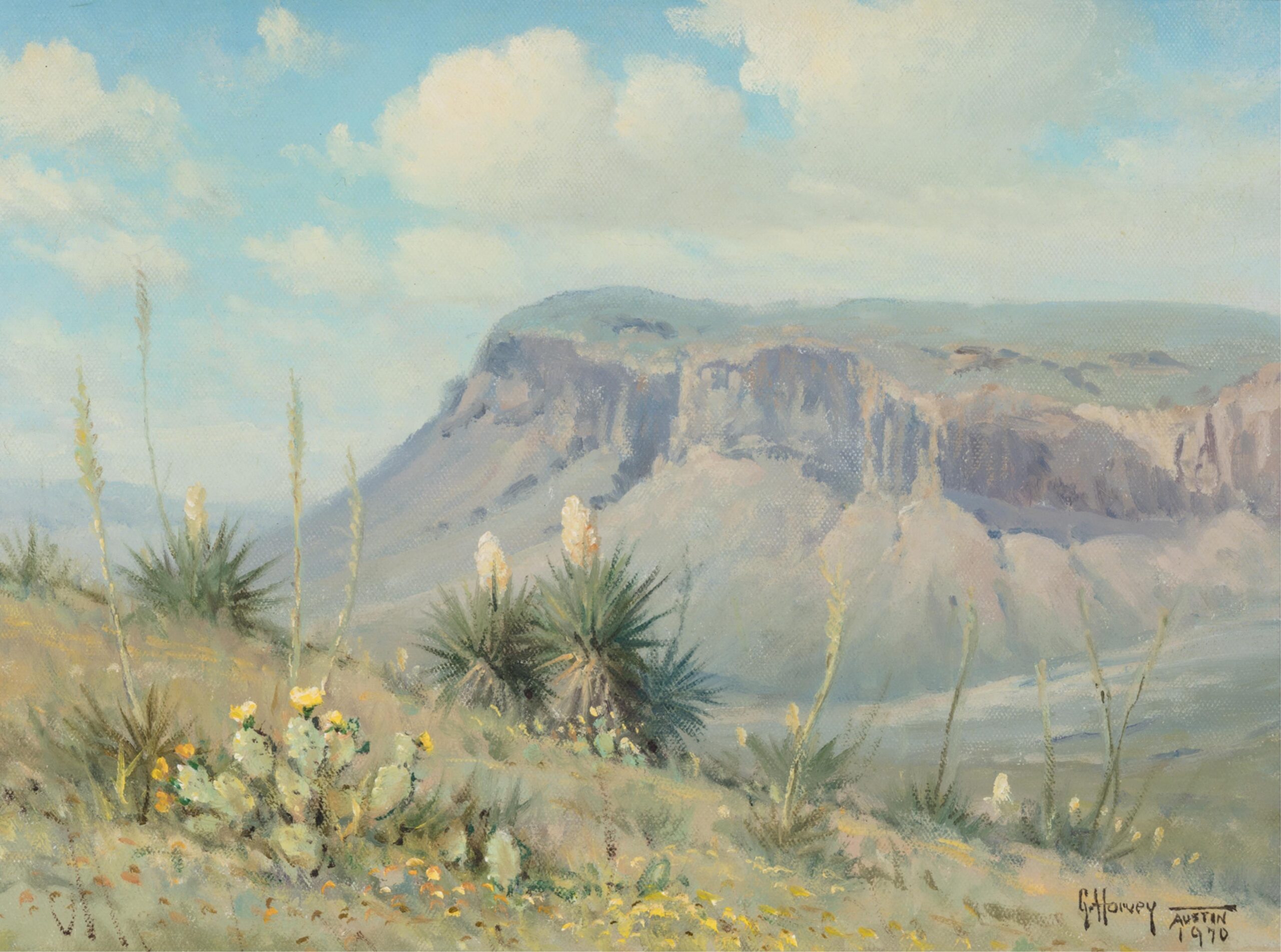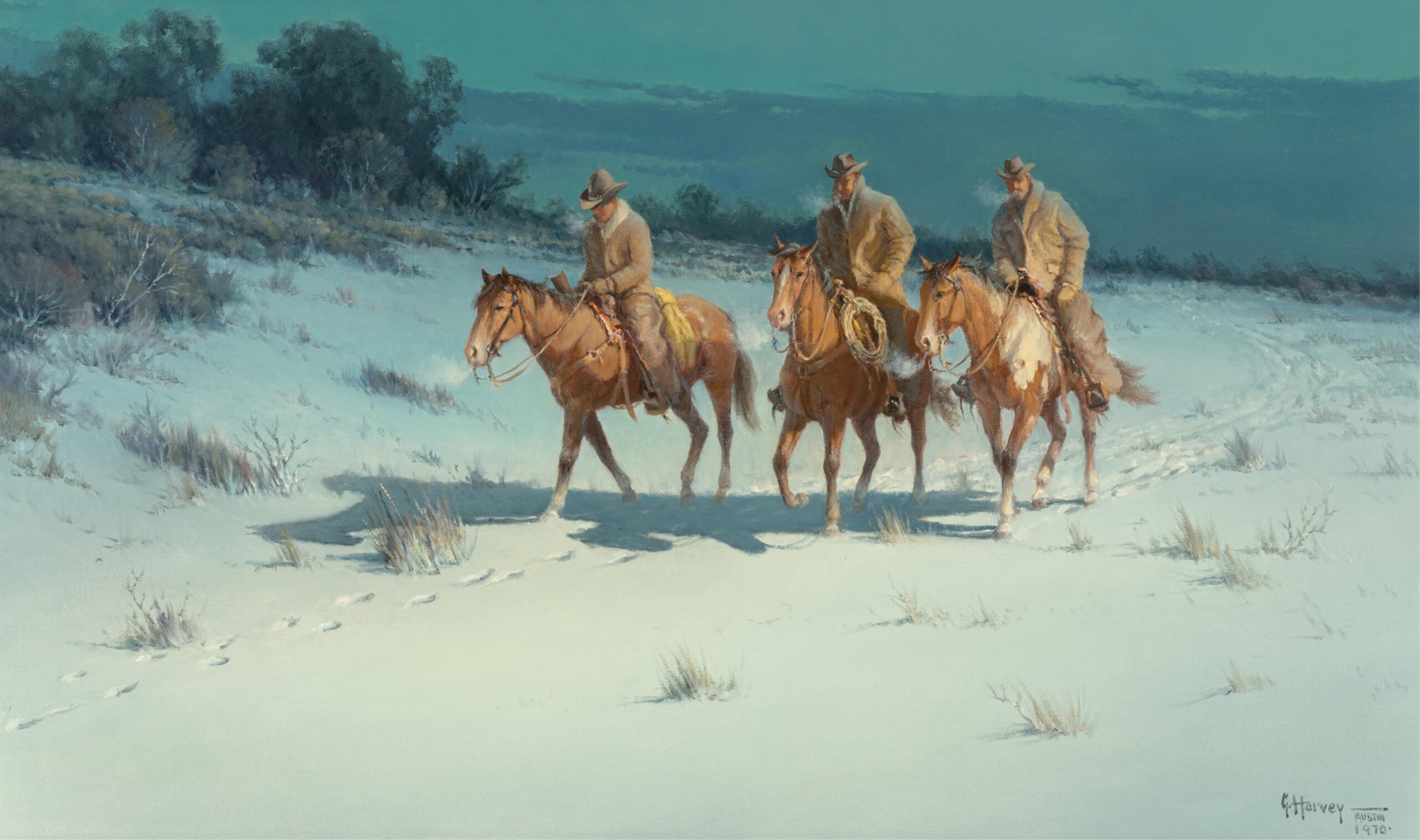 G. Harvey, born Gerald Harvey Jones in 1933 in San Antonio, Texas, was a renowned Western and American Impressionist painter celebrated for his evocative depictions of historical and frontier life. Inspired by the rugged landscapes and pioneer spirit of the American West, Harvey’s work often focused on themes of perseverance, tradition, and patriotism. His signature style blended romanticism with realism, capturing cowboys, oilmen, and bustling turn-of-the-century cityscapes bathed in the warm glow of lamplight or twilight. Harvey conveyed motion and atmosphere, often portraying scenes of daily life that echoed the values of hard work, faith, and heritage. Whether illustrating horseback riders crossing stormy plains or elegant 19th-century street scenes, his paintings conveyed a deep nostalgia for America’s past. Harvey’s work has been displayed in the White House and prestigious collections, and his legacy continues to influence contemporary Western art.